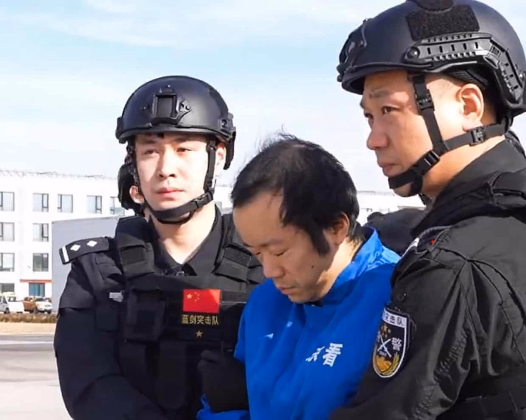 Bộ Công an Trung Quốc công bố đoạn video cho thấy ông trùm 38 tuổi bị còng tay, trùm túi đen lên đầu, được áp giải rời máy bay với các lực lượng an ninh vũ trang chờ sẵn trên đường băng.